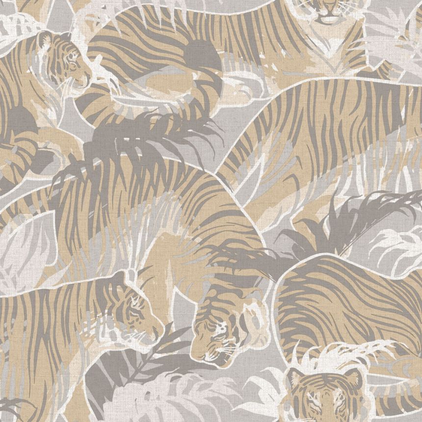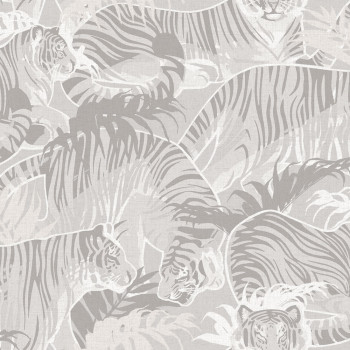 Vliesová tapeta s vinylovým povrchem, jemná látková textura, motivy tygrů a palmových listů, odstíny šedé a béžové.