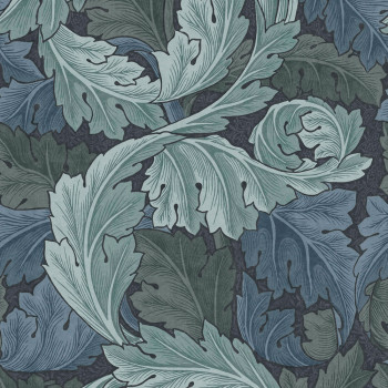 Vliesová tapeta na zeď, secesní vzor listů v odstínech modré, tyrkysové a šedé.