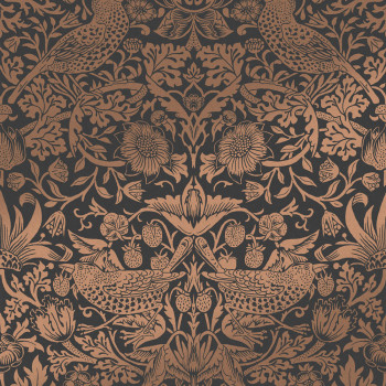 Vliesová tapeta na zeď, bohatý ornamentální vzor s květinami, listy, ptáčky a jahodami, odstíny šedo-černé a bronzové.