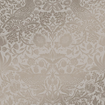 Vliesová tapeta na zeď, bohatý ornamentální vzor s květinami, listy, ptáčky a jahodami, odstíny šedo-béžové a kovová metalická.