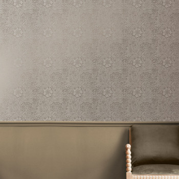 Pololesklá vliesová tapeta na zeď, bohatý květinový ornamentální vzor v odstínech šedo-béžové a kovově lesklé.