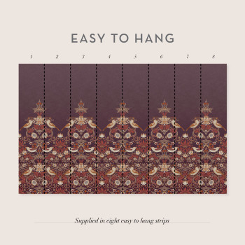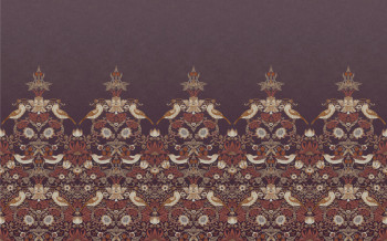 Vliesová tapeta na zeď, bohatý ornamentální vzor s květinami, listy, ptáčky a jahodami, odstíny vínové, hnědé, béžové a oranžové.