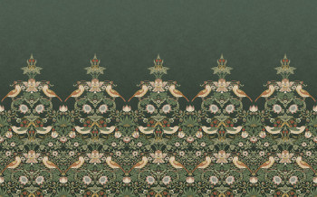 Vliesová tapeta na zeď, bohatý ornamentální vzor s květinami, listy, ptáčky a jahodami, odstíny zelené, růžové a okrové.
