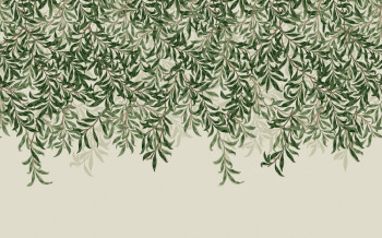Vliesová obrazová tapeta na zeď, bohatý vzor s větvičkami v odstínech zelené.