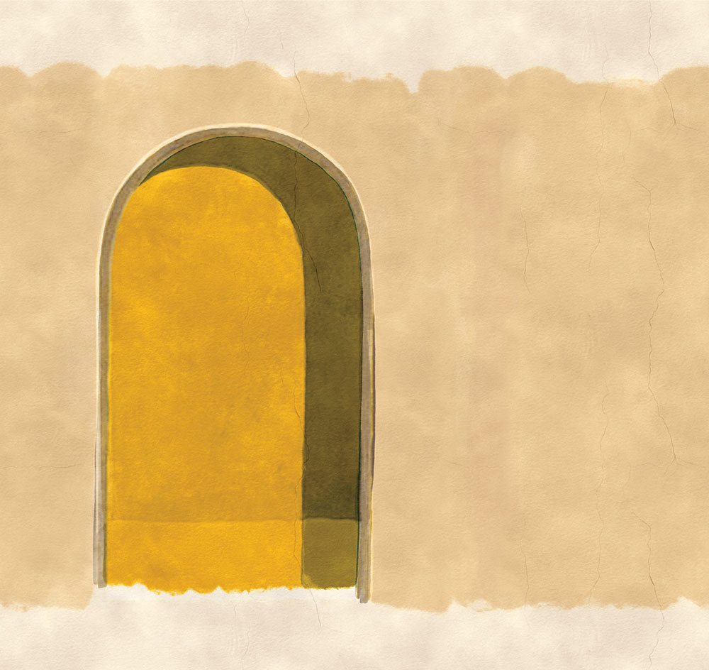 Vliesová obrazová tapeta na zeď, podloubí v odstínech šafránově žluté a béžové.