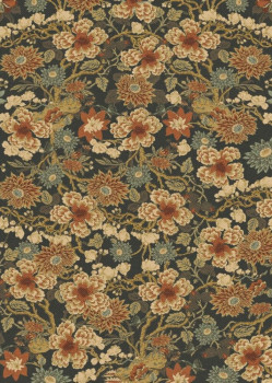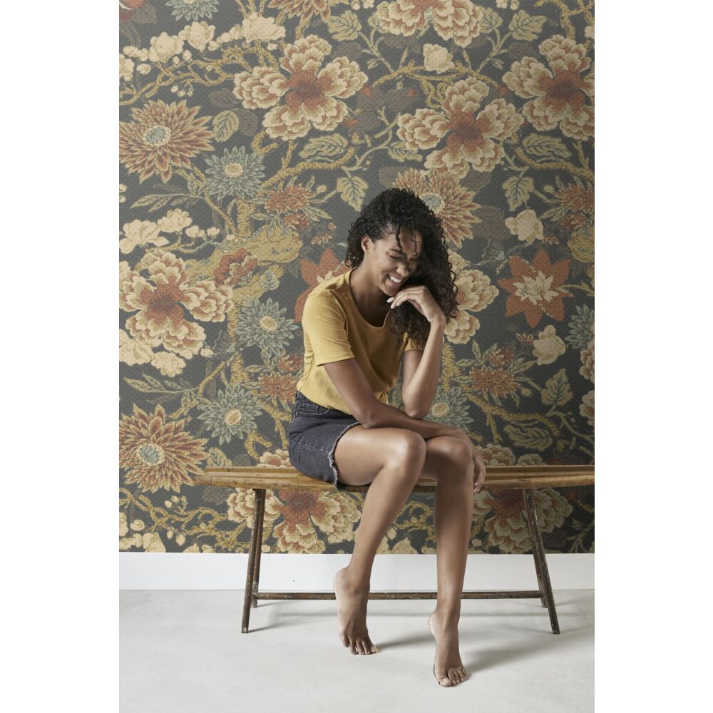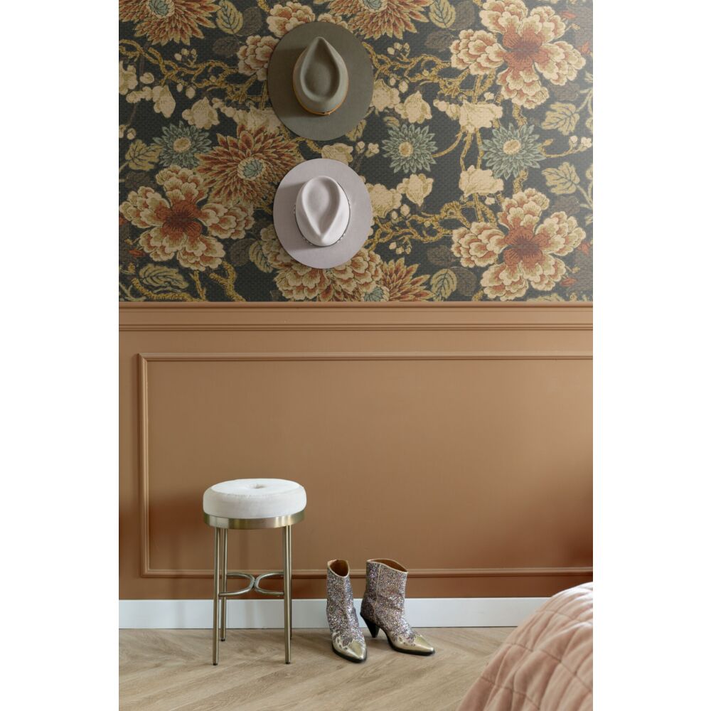 Květinová vliesová tapeta na zeď, odstíny hnědé, béžové a černé.