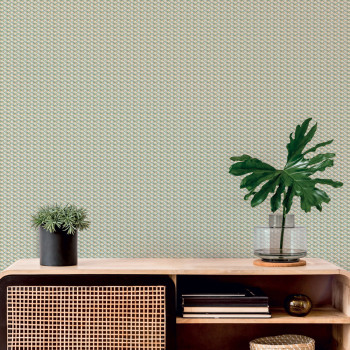 Plastická vliesová tapeta s vinylovým povrchem, krémový podklad, geometrický vzorek v odstínech pololesklé zelené a béžové.