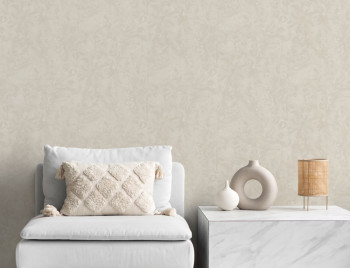 Jemně plastická vliesová tapeta s vinylovým povrchem, imitace štukové omítky, odstíny bílo-krémové, metalický pololesk.