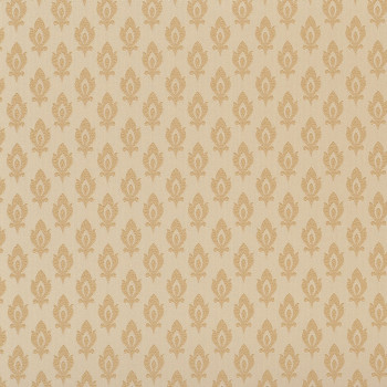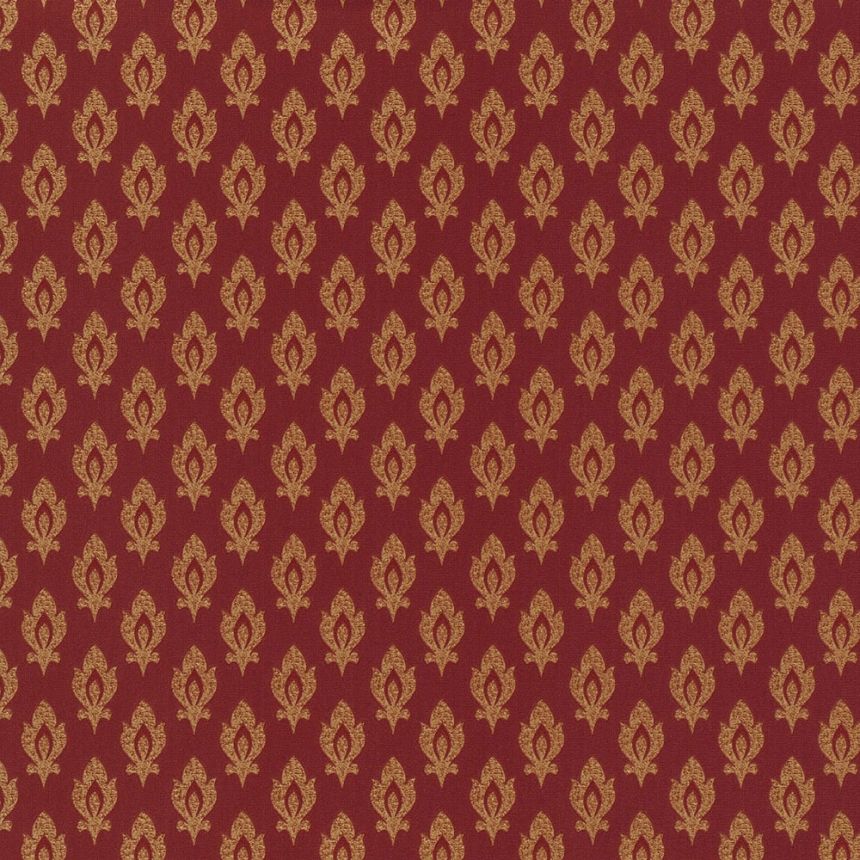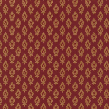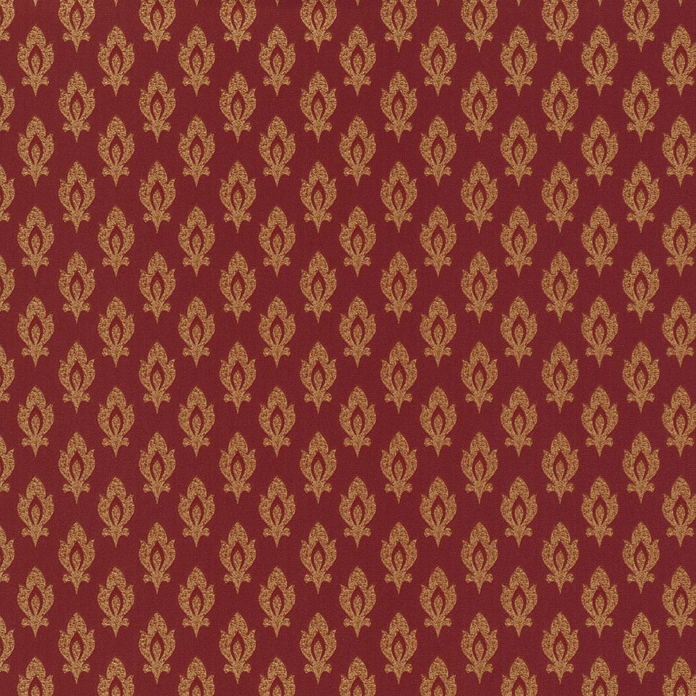 Vliesová tapeta s vinylovým povrchem. Plastický okrově-zlatý ornamentální vzorek na pololesklém červeném podkladu.