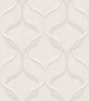 Jemně plastická vliesová tapeta s vinylovým povrchem, imitace hrubší tkaniny v odstínech šedo-krémové, ornamentální vzor mat a jemný lesk.