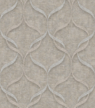 Jemně plastická vliesová tapeta s vinylovým povrchem, imitace hrubší tkaniny v odstínech hnědo-šedé, ornamentální vzor pololesk šedý a hnědý.