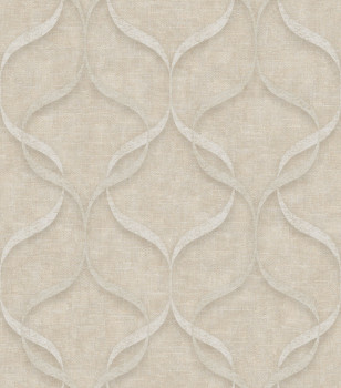 Jemně plastická vliesová tapeta s vinylovým povrchem, imitace hrubší tkaniny v odstínech šedo-béžové, ornamentální vzor mat a jemný lesk.