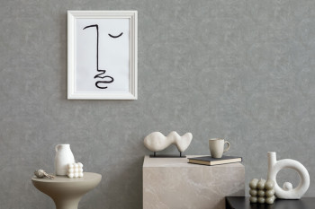 Jemně plastická vliesová tapeta s vinylovým povrchem, imitace štukové omítky, šedý pololesk.
