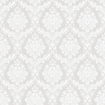 Jemně plastická, pololesklá vliesová tapeta s vinylovým povrchem, zámecký vzor v odstínech šedé a bílé.