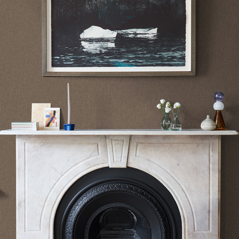 Hladká vliesová tapeta na zeď, design imitující látkovou strukturu v odstínech čokoládově hnědé.