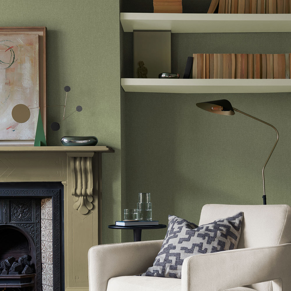Hladká vliesová tapeta na zeď, design imitující látkovou strukturu v odstínech šalvějově zelené.