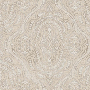 Luxusní, plastická, vliesová tapeta s vinylovým povrchem, odstíny šedo- béžové, béžový ornamentální zámecký vzor s jemným zlatavým pololeskem.