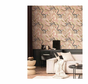 Vliesová tapeta na zeď, motivy lemurů a listů v odstínech okrové, béžové a černé na starorůžovém podkladu.