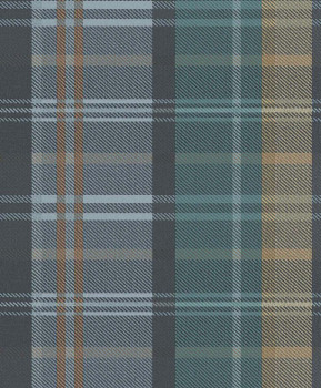 Vliesová tapeta na zeď, imitace tartanové látky v odtínech tyrkysové, modré a hnědo-bronzové.
