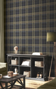 Vliesová tapeta na zeď, imitace tartanové látky v odstínech modré, zelené, okrové a šedé.