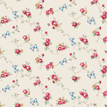 Vliesová tapeta na zeď, krémový podklad, motiv květin a mašliček v odstínech zelené, červené, okrové a modré.