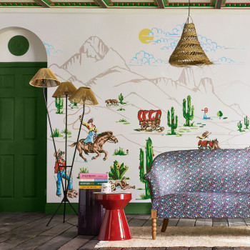 Vliesová obrazová tapeta na zeď, krémový podklad, motivy Cowgirls a rostlin.