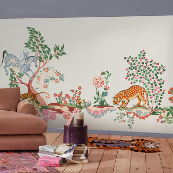 Vliesová obrazová tapeta na zeď, krémový podklad, motivy rostlin a zvířat.