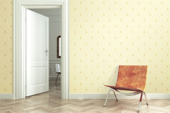Vliesová tapeta s vinylovým povrchem. Plastický ornamentální zlato-béžový vzor na okrovém podkladu.