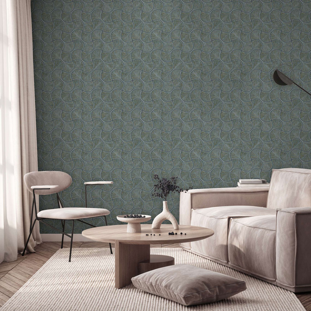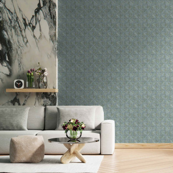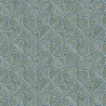 Geometrická vliesová tapeta s vinylovým povrchem, výrazné textury, odstíny pololesklé modro-zelené, akcenty hnědo-zlaté.