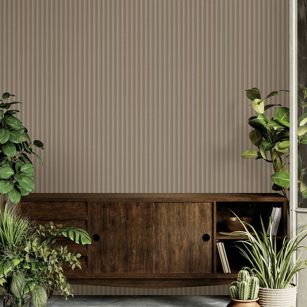 Vliesová tapeta s vinylovým povrchem, imitace proplétané lýkové rohože, odstíny pololesklé hnědé se stříbrnými akcenty vytváří pruhy.