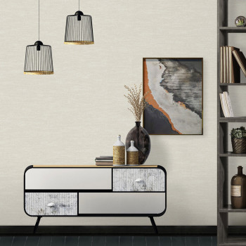 Vliesová tapeta s vinylovým povrchem, odstíny šedo-béžové, látková textura.