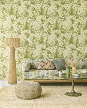 Vliesová tapeta na zeď, vzor listů v zelených odstínech, podklad hnědo-béžový/khaki, výrazně plastická textura.