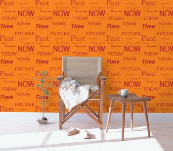 Vliesová tapeta. Červené nápisy na oranžovém podkladu.