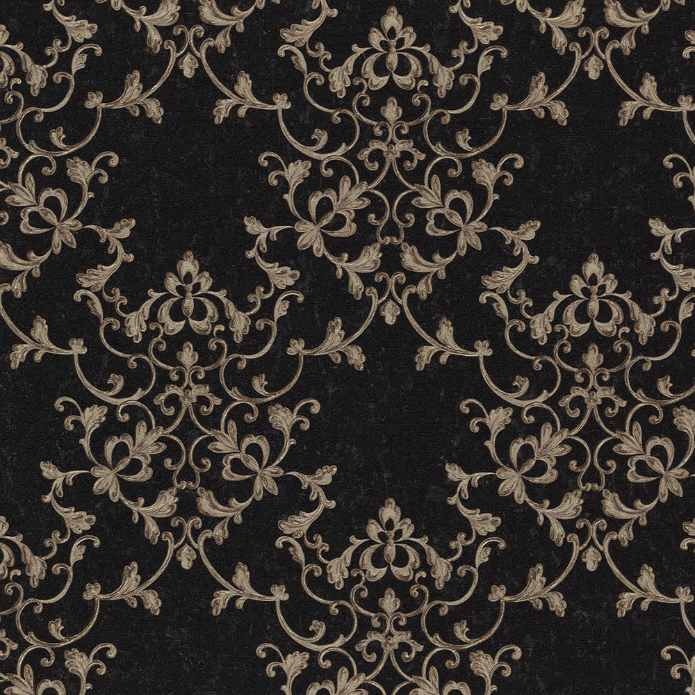 Vliesová tapeta s vinylovým povrchem. Plastický zlatý ornamentální vzor na černěm pololesklém podkladu.