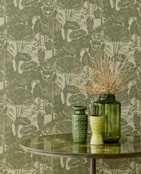 Vliesová tapeta na zeď, motivy listů a stromů v odstínech zelené.