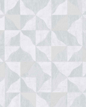 Vliesová tapeta s vinylovým povrchem, geometrický vzor, hrubší žíhaná textura, odstíny pololesklé šedé a šedo-béžové.