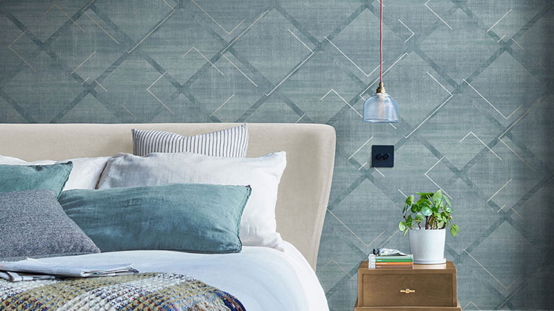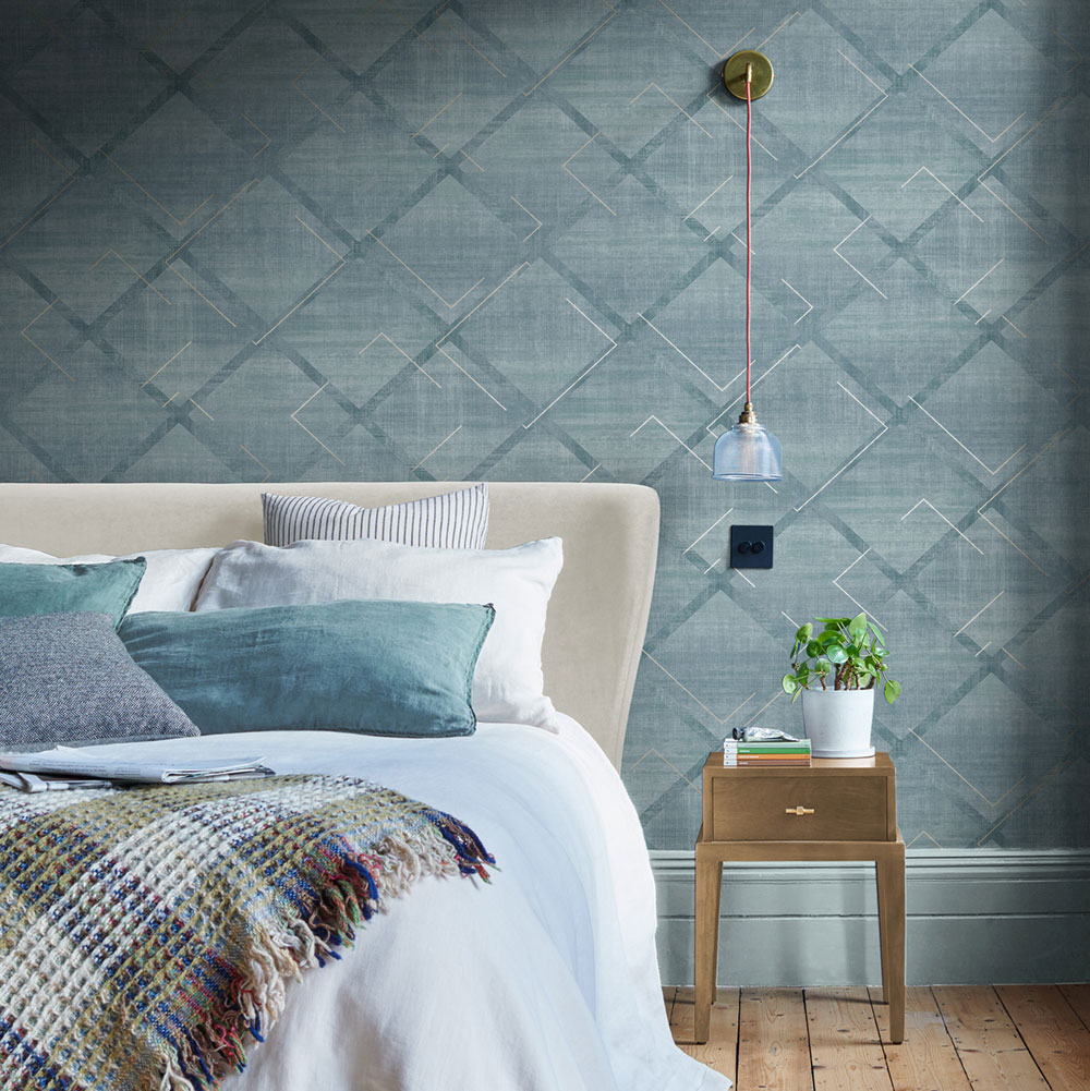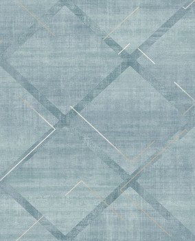 Vliesová tapeta na zeď, geometrický vzor v odstínech matné modré, stříbrné linie, jemně plastická textura.