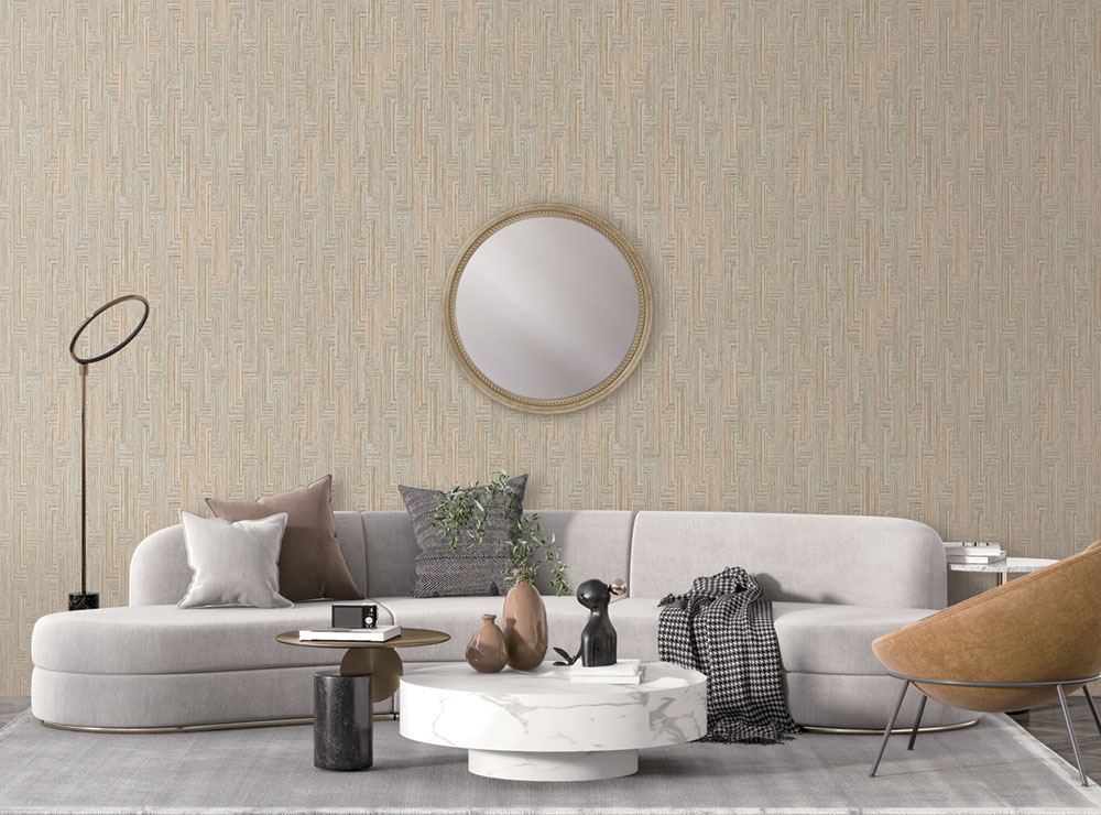 Vliesová tapeta s vinylovým povrchem, geometrický vzor, provázková textura, odstíny béžové a šedo-stříbrné.