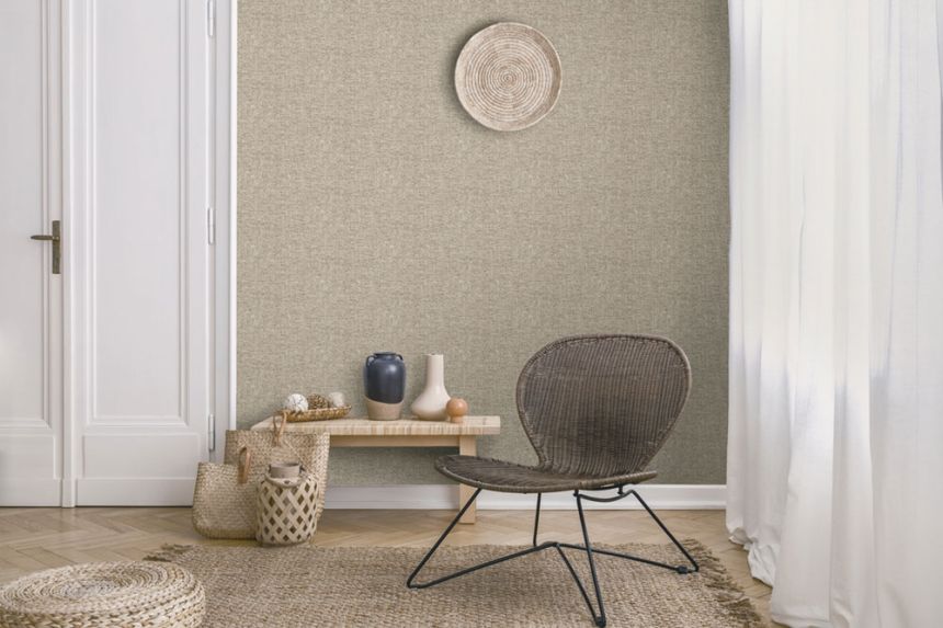 Design hrubé textilie, hnědá melanž, pololesk. Jemně plastická textura. Podklad vlies, povrch vinyl.