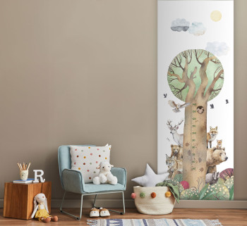 Vliesová tapeta na zeď / metr, dětský motiv stromu a lesních zvířátek, odstíny zelené, modré, šedé, hnědé, červené, žluté, podklad bílý.