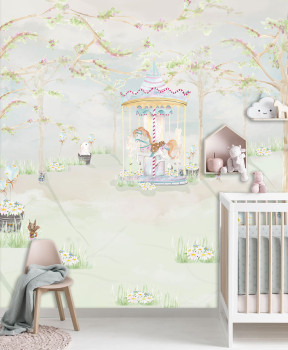 Vliesová tapeta na zeď, motiv kolotoče a zvířátek v přírodě.