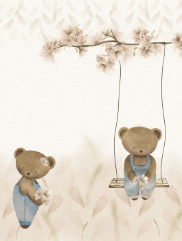 Vliesová tapeta na zeď, dětský motiv medvídků na houpačce v odstínech béžové, modré a hnědé.
