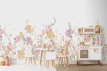 Vliesová tapeta na zeď, motiv květin, včelek a berušek, odstíny zelené, růžové, žluté a fialové.