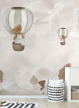 Vliesová tapeta na zeď, dětské motivy medvídků a balonů v odstínech šedé, hnědé a béžové.