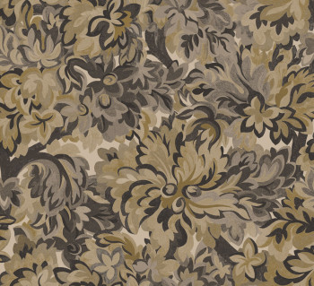 Hladká vliesová tapeta na zeď, květinový vzor v odstínech hnědé, khaki, šedé a černé.