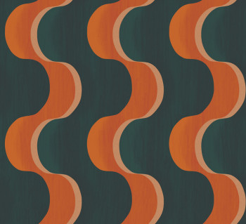 Hladká vliesová tapeta na zeď, efekt 3D vln v odstínech matné tmavě zelené, cihlové hnědo-oranžové a pololesklé zlato-béžové.