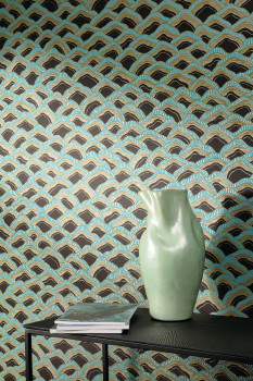 Vliesová tapeta na zeď, jemně plastický, pololesklý vzor inspirovaný horskou krajinou, odstíny černé, zelené a tyrkysové, stříbrné detaily.