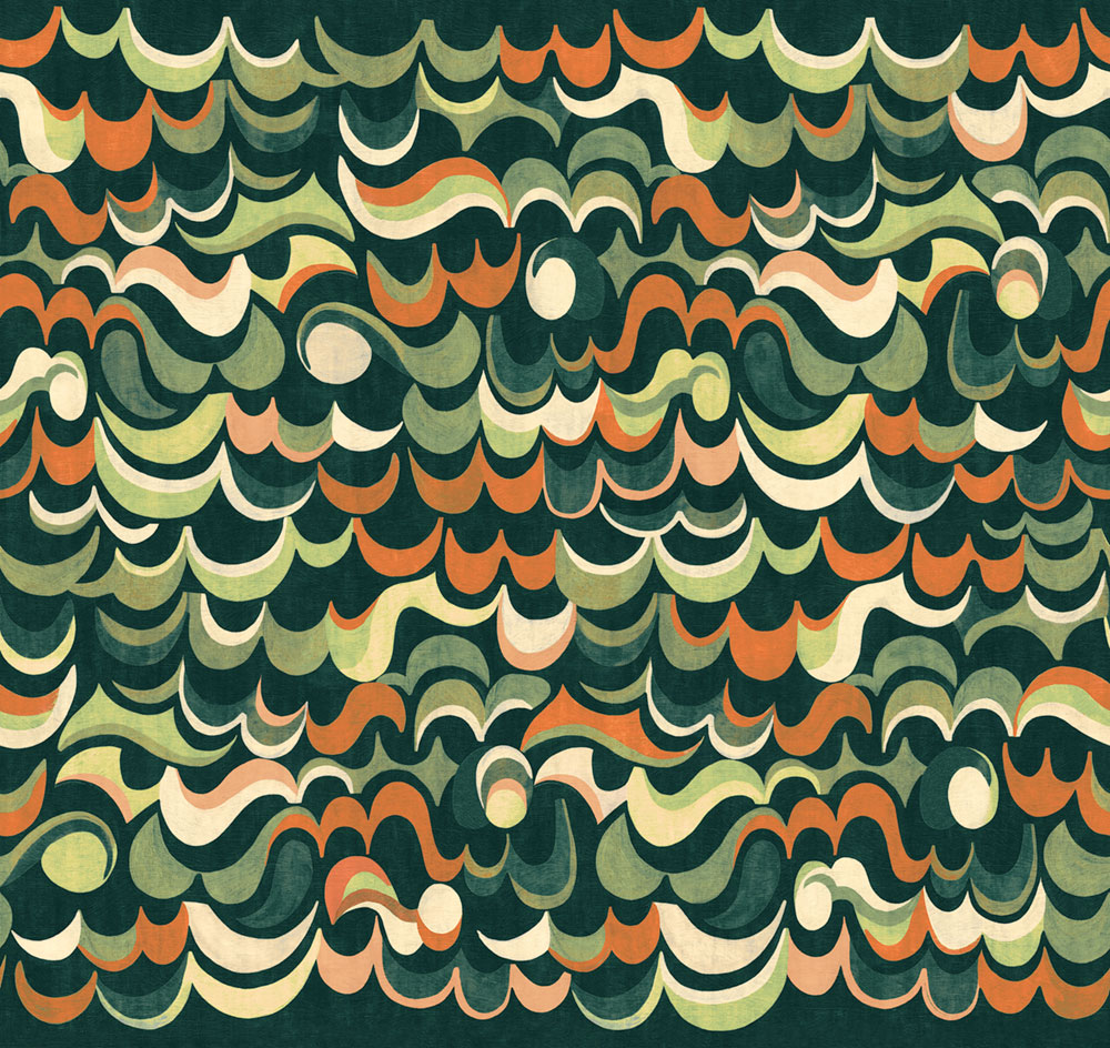 Vliesová obrazová tapeta na zeď, vlnkový vzor v odstínech zelené a cihlově červené.