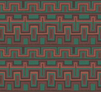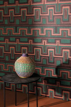 Vliesová tapeta na zeď, jemně plastický grafický etno vzor v odstínech černé, hnědé, zelené, místy bronzové akcenty.