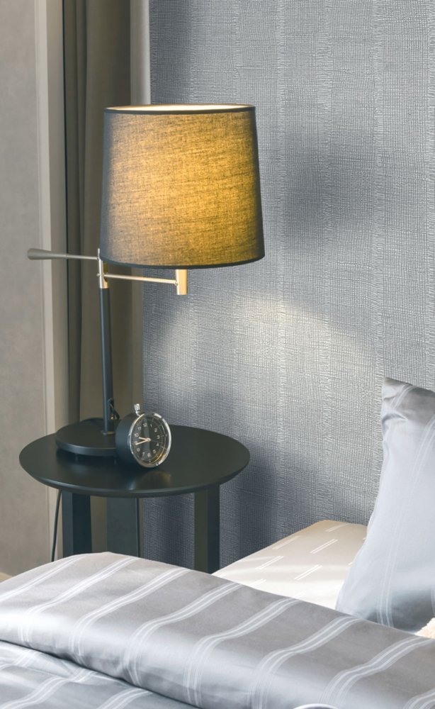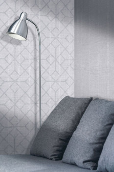 Design hrubé textilie s jemně plastickou nepravidelnou texturou tvořící pruhy. V odstínech šedé. Podklad vlies, povrch vinyl.